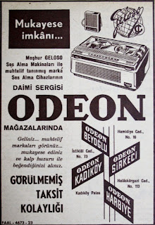 Mukayese imkanı Meşhur GELOSO ses alma makineleri ile muhtelif tanınmış marka ses alma cihazlarının DAİMİ SERGİSİ ODEON MAĞAZALARINDA Geliniz... Muhtelif markaları görünüz... Mukayese ediniz ve kalp huzuru ile beğendiğinizi alınız... GÖRÜLMEMİŞ TAKSİT KOLAYLIĞI...1962 |