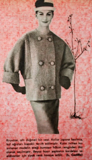 Kruvaze, 6 düğmeli bir vest. Kollar japone kesilmiş, kol ağızları kapaklı tercih edilmiştir. Kalın tüvitten hazırlanan modelin eteği kumaşın hakim renginden düz olarak seçilmiştir. Beyaz hasır şapkanın kurdelesi ve eldivenler için siyah renk tavsiye edilir...Lanvin Castillo 1959 |