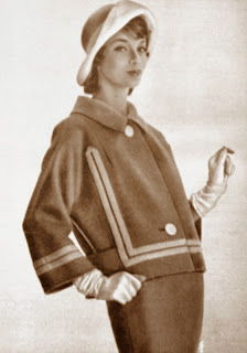 Nina Ricci moda evinin takdim etmiş olduğu bilhassa seyahatlerde giyilebilecek, açık yünlüden, japone kollu pratik kollu bir ansambl. Geniş kol yaparken koltuk altına kuş koyarak kumaşı sakatlamaktan sakınmalısınız. Ceketin üzerinde yer alan bantlar ve aksesuar beyaz renklidir...1959 |