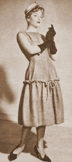 Belden takriben bir karış aşağısı volan büzgü yapılmış, siyah-beyaz renkte bir tüvit elbise. Ön ortada aynı kumaştan yapılmış bir fitille yerleştirilen düğüm bu senenin bir yeniliği. Arka, belden dört parmak aşağıya kadar düğmelidir...Nina Ricci 1959 |