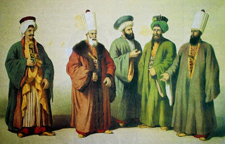 Osmanlı döneminde devletin değişik kademelerinde hizmetlerde bulunmuş görevlilerin o döneme ait geleneksel kostümleri içinde görünümleri... Soldan sağa : Baş çuhadar, Defterdar, Defter emini, Nişancı efendi ve Darphane emini. (Les Ancies costumes de L'empire Ottoman, Paris, ty 1864) Kulluk neferi (sol) ve Cebehane karakullukçusu. |