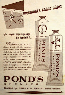 Mesamata kadar nüfuz. İşte suyun yapamayacağı bir temizlik !... Filhakika, POND'S COLD (Gece) kremi cildinizin mesamelerine kadar nüfuz ederek orada sindirilmiş makyaj kalıntıları ile toz, ter ve diğer tahripkar maddeleri massederek cildinizi temizler, besler ve yumuşatır. POND'S VANISHING (Gündüz) kremi makyajınıza en müsait zemini hazırlar ve pudranızı bütün gün devamınca idame ettirir. POND'S KREMLERİ Güzelliğiniz için POND'S C ve POND'S V birbirini tamamlar...1959 |