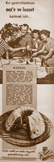 Kır gezintilerinize neşe ve lezzet katmak için... MARBRE Kullanılacak malzeme : 250 gram SANA, 250 gram şeker, 4 bütün yumurta, bir tutam tuz, limon kabuğu rendesi, 500 gram un, iki buçuk kahve kaşığı beking povder, 1 desilitre süt (100 gram), 30 gram kakao, 25 gram şeker, 2 çorba kaşığı süt (koyu renk hamur için). Yapılması : SANA bir kapta iyice dövülür sonra yavaş yavaş şeker, 4 bütün yumurta, tuz, limon kabuğu rendesi ilave edilir. Beking povderli un ve süt münavebe ile konur. Oldukça katı bir hamur elde edilince, üçte ikisi yağlanmış bir delikli yuvarlak kalıba doldurulur ve kalan kısma kakao, şeker ve biraz süt karıştırılarak koyu renkte olan bu hamur ötekinin üzerine dökülür. Marbre şeklini vermek için bir çatal ile zigzaglar yaparak 2 hamur karıştırılır. Daha sıhhi ve daha lezzetli yemekleriniz için. Sana Nebati Margarin (1959) |