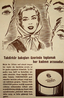 Takdirkar bakışları üzerinde toplamak her kadının arzusudur... Böyle bir iltifata nail olmak isteyen her kadında kendisine evvela iyi bir pudra seçmesini bilmelidir. İyi bir pudra ince, hafif ve fevkalade setr edici olmalıdır. Krem köpüğü ihtiva eden Tokalon FASCINATION pudrasından teninize yakışan rengi seçerek tatbikata girişiniz. Tokalon FASCINATION pudrası inceliği sayesinde cildinize mükemmelen intibak eder ve pudralanmış olduğunuz hissini dahi uyandırmadan, yüzünüzü daha taze, daha cazip ve üstün gösterişli hale getirir...1959 |