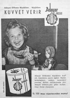Adayar Glikozu : Büyüklere... Küçüklere KUVVET VERİR Adayar Glikozları büyüklere kudret, küçüklere enerji sağlar. Hazmı kolaylaştırır, mideyi ve karaciğeri yormaz. Bütün tatlılarınızda yarı Adayar Glikozu, yarı şeker kullanmayı ihmal etmeyiniz. % 100 mısır nişastasından mamul...1959 |