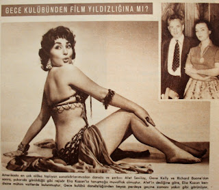 GECE KULÜBÜNDEN FİLM YILDIZLIĞINA MI ? Amerika'da en çok alaka toplayan sanatkarlarımızdan dansöz ve şarkıcı Afet Sevilay, Gene Kelly ve Richard Boone'dan sonra, yukarıda görüldüğü gibi rejisör Elia Kazan'la tanışmaya muvaffak olmuştur. Afet'in dediğine göre, Elia Kazan kendisine mühim vaatlerde bulunmuştur. Gece kulübü dansözlükten beyaz perdeye geçme zamanı yakın gibi görünüyor...1959 |