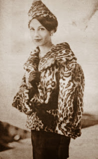 Ozelo veya leopar kürkünden erkek yakalı ceket ve şapka takımı.