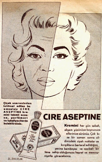 CIRE ASEPTINE Kremini her gün sabah akşam yüzünüze, boynunuza, ellerinize sürünüz. Çok kısa bir zaman sonra cildinizdeki siyah noktalar ve kırışıkların bertaraf edildiğini, yerine bembeyaz ve cazibeli bir tene sahip olduğunuzu hayret ve memnuniyetle göreceksiniz. * Çiçek usaresinden istihsal edilen bu emsalsiz CİRE ASEPTİNE kremini tekmil eczane, parfümeri ve tuhafiyecilerde bulabilirsiniz...1959 |