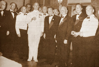 DONANMA BALOSU Preveze zaferinin 421. yıl dönümü ile ilgili olarak Boğazlar ve Marmara Korkomutanlığı binasında 27 eylül pazar gecesi verilen baloda bulunanlardan (ön sıra soldan sağa) Rauf Orbay, Koramiral Zeki Özak, Akdeniz 6. filo uçak gemileri grup kumandanı tümamiral Thomas H. Moorer, Başvekil Adnan Menderes, Ali Fuat Cebesoy, Dr. Namık Gedik ve Oramiral Fahri Korutürk (Deniz kuvvetleri kumandanı) görülmektedir...1959 |