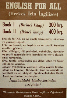 ENGLISH FOR ALL (Herkes için İngilizce) Book I (Birinci kitap) 300 kuruş Book II (İkinci kitap) 400 kuruş. English for all en iyi usulle konuşmayı, okumayı ve yazmayı öğretir. EFA en önemli, en faydalı ve en pratik konuları etraflıca gösterir. EFA dil bilgisi, fiil çekimleri, vokabüler, deyimler ve çeşitli egzersizleriyle lisandaki her türlü eksiklerinizi tamamlar. EFA ecnebi kitaplardan çok daha üstün ve fakat çok daha ucuzdur. Maarif Vekaletinin yardımcı kitap olarak tavsiye ettiği bu kitaplar Türkiye'nin lisan hususunda en tecrübeli ve en ehliyetli öğretmenlerinden Habib Ayral tarafından yazılmıştır. İstanbul'daki kitap evlerinden isteyiniz ! Müracaat : Galatasaray Lisesi İngilizce Öğretmeni HABİB AYRAL. (1959) |