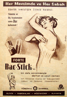 Her Mevsimde ve Her Sabah Günlük temizliğin 3. kaidesi : Yıkanma ve diş fırçalamadan sonra Bac kullanmak ! FORTE Bac-Stick'in bir defa sürülmesiyle derhal ve uzun zaman için kendinizi müziç ter kokularından masun ve tertemiz hissedersiniz ! TÜRK KİMYA İSTANBUL OLIVIN FABRİKALARI MÜSTAHZARI - ALMANYA (1959) |