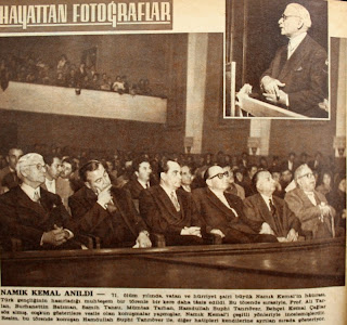 "HAYATTAN FOTOĞRAFLAR" NAMIK KEMAL ANILDI 71. ölüm yılında, vatan ve hürriyet şairi büyük Namık Kemal'in hatırası, Türk gençliğinin hazırladığı muhteşem bir törenle bir kere daha taziz edildi. Bu törende sırasıyla Prof. Ali Tarlan, Burhanettin Batıman, Samih Tansu, Mümtaz Tarhan, Hamdullah Suphi Tanrıöver, Behçet Kemal Çağlar söz almış, coşkun gösterilere vesile olan konuşmalar yapmışlar. Namık Kemal'i çeşitli yönleriyle incelemişlerdir. Resim, bu törende konuşan Hamdullah Suphi Tanrıöver ile diğer hatipleri kendilerine ayrılan sırada gösteriyor...1959 |