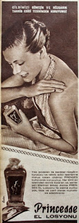 CİLDİNİZİ GÜNEŞİN VE RÜZGARIN TAHRİP EDİCİ TESİRLERİNDEN KORUYUNUZ. Yaz sıcakları ile beraber rüzgarın kurutucu ve tahrip edici tesirlerine maruz kalan cildinizi PRENSES kullanarak koruyunuz. Her türlü ev işlerinden sonra kızaran ve sertleşen ellerinizi birkaç damla PRENSES EL losyonu ile daima yumuşak, taze ve zarif olarak muhafaza edebilirsiniz. Princesse EL LOSYONU (1959) |