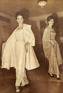 SOL : Siyah satenden straplez bir tuvalet. Beden düz ve sıkıdır. Kumaşın yanlardaki taşkınlığı modeli epey şık bir hale getirmektedir. SAĞ : Siyah yünlü kumaştan çok pratik bir tuvalet. Atkı havasındaki büyük yaka belden aşağıya kadar inmektedir. Kollar kısadır... 1959 Rapuano |