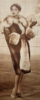 Ritz moda evinin sunduğu ekose, kürklü bir manto modeli. Kahverengi ve kırmızı renkli olan manto dar ve japone kolludur. Kol ağzı ve önde mantonun iç tarafına döndükten sonra eteğe kadar uzanan geniş yaka kırmızıya çalan renkte tilki kürkünden yapılmıştır...1959 |