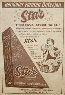 Harikalar yaratan deterjan Star Piyasaya arz edilmiştir. Bugüne kadar sabunla yaptığınız çamaşır yıkamasını şimdi deterjan STAR ile daha çabuk, daha kolay ve daha ucuz yapacaksınız. Star Her şeyi yıkar, temizler, çamaşırınıza DAHA PARLAK bir beyazlık temin eder. Star Harikalar yaratan Deterjan NEKA KİMYEVİ MADDELER FABRİKASI (1959) |
