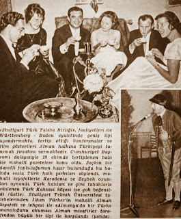 "Stuttgart Türk Talebe Birliği" faaliyetleri ile Württemberg - Baden eyaletinde geniş ilgi uyandırmakta, tertip ettiği konferanslar ve film gösterileri Alman halkına Türkiyeyi tanımak fırsatını vermektedir. Cumhuriyet bayramı dolayısıyla 29 ekim'de tertiplenen balo ise mahalli gazetelere konu oldu. Seçkin bir davetli topluluğunun hazır bulunduğu bu baloda sazla Türk halk şarkıları söylendi, mahalli kıyafetlerle Karadeniz ve Zeybek oyunları oynandı. Türk halıları ve çini tabaklarla süslenen Türk kahvesi köşesi ise çok beğenildi (üstte). Stuttgart Teknik Üniversitesi talebelerinden İlhan Türker'in mahalli Alman kıyafeti ve lehçesi ile "Almanya'da bir Türk" monoloğunu okuması Alman misafirler tarafından büyük bir ilgi ile karşılandı (yanda)...1959 |