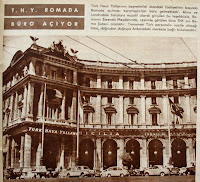 THY ROMA'DA BÜRO AÇIYOR Türk hava yollarının beynelmilel alandaki faaliyetinin başında Roma'da açılması kararlaştırılan büro gelmektedir. Atina ve Londra'daki bürolara muadil olarak girişilen bu teşebbüsle, Roma'nın Essendo meydanı'nda resimde görülen bina THY'nın Roma şubesi olacaktır. Tamamen Türk personelin vazife alacağı büro doğrudan doğruya Ankara'daki merkeze bağlı bulunacaktır...1959 |