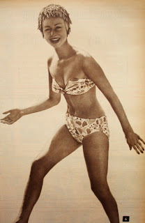 Lasteks faydan askısız bir mayo. Sırtında boydan boya bir fermuar bulunmaktadır. Önündeki çapraz bantlar ve geniş fiyonk beyaz pikeden yapılmıştır. Modelin ismi "Lac"tır... 1959 Vetrix Bleyle |