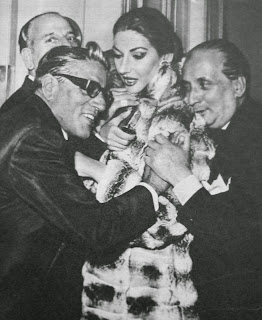 AİLE ALBÜMÜ İÇİN Bülbül sesli hırçın primadonna Maria Callas sabahın üçünde Dorchester otelini terk ederken 7 denizin kralı Aristotle Onassis üzerine koşarak bir resim daha çekilmesini istedi. Ünlü sopranonun kocası ve İtalyanın sayılı para babalarından Giovanni Meneghini (sağda) karısının rutubetli Londra gecesinde altın değerindeki sesini üşütmemek için giydiği kürke kedi gibi sokularak birlikte poz verdi. Onassis bu fotoğrafı "Aile Albümü"nün baş köşesine koymak için çektirdiğini dile getirdi... |