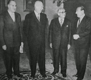 Fatin Rüştü Zorlu, Dwight Eisenhower, Celal Bayar, Adnan Menderes resmi müzakerelerden evvel Çankaya köşkünde. Resmi ziyafette de devam eden görüşmelerde siyasi ve iktisadi meselelerde tam bir görüş birliği elde edilmiştir... |