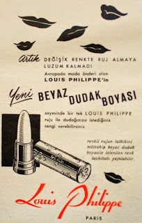 Artık değişik renkte ruj almaya lüzum kalmadı. Avrupa'da moda önderi olan LOUIS PHILIPPE'in Yeni BEYAZ DUDAK BOYASI sayesinde bir tek LOUIS PHILIPPE ruju ile dudağınıza istediğiniz rengi verebilirsiniz. Renkli rujun tatbikini müteakip beyaz dudak boyası ile istenilen renk tashihatı yapılabilir. Louis Philippe PARIS 1959 |