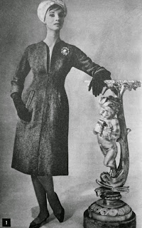 3) Tüvit ve saten kumaştan bir tayyör. Ceket uzundur. Kenarına saten geçirilmiş ve düğmelerde satenden yapılmıştır. İçine giyilen bluzda aynı satenden tunik biçimindedir. Etek çok dar ve geçen yıla nazaran biraz daha uzundur. 4) "Zeytin" biçiminde etekli küçük bir elbise daha. Kesiksiz ve az oturmuş olan beden kalça üzerine kadar inmektedir. Kalça üzerindeki kuptan çıkan büzgüler eteğin aşağı kısmını hafifçe bollaştırarak zeytin biçimini meydana getirmektedir. |