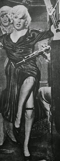 KAHKAHADAN KIRIYOR ! Marilyn Monroe, iki yıllık bir ayrılıktan sonra "Some like it hot" (Bazıları onu sıcak sever) adlı film ile tekrar perdeye döndü. Film geçenlerde Amerika sinemalarında gösterilmeye başladığı zaman hayranları Marilyn'i candan alkışladılar. Kabiliyetli aktrisi yine milyonların taktirine mazhar kılan bu film, 1920 yıllarının Chicago'sunda cereyan etmiş deli dolu bir olay zincirini nakletmektedir. Bilindiği gibi o sıralarda Chicago şehri gangsterlerin yatağı haline gelmiş tehlikeli bir şehir idi. Marilyn Monroe'nun filmdeki rol arkadaşları Tony Curtis ve Jack Lemmon buradaki gece kulüplerinden birinde çalışan iki çalgıcı rolündedir. İki kafadar, gangsterlerin bir cinayetine şahit olduktan sonra gözden kaybolmaya çalışırlar. Kahramanlarımız kadın kıyafetine bürünerek sırf kadınlardan kurulu bir orkestrada iş bulmaya muvaffak olacaklardır. Marilyn bu orkestranın cırtlak sesli şarkıcısıdır. Sarışın aktris bu deli dolu komedide seyircileri kahkahaya gark etmektedir...1959 |