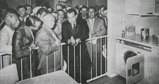 EŞLER (Soldan itibaren) : Bayan Anastas Mikoyan, Bayan Richard Nixon, Bayan Nikita Kruşçev ve Bayan Frol Kozlov, Kruşçev'in Moskova civarındaki yazlık evinde. 23 temmuz 1959 günü perşembe gecesi dünyadaki diplomatik gürültü ve fısıltılar dinmiş bütün diplomatlar kulaklarını Moskova'ya vermişlerdi. Amerika birleşik devletleri başkan yardımcısı Richard Milhous Nixon, Sokoiniki parkında Amerikan sergisini açmak üzere 35 kişilik resmi ve 56 kişilik Amerikalı gazeteci ile o gün Moskova'ya inmişti. Bu sergi Sovyetlerin Manhattan'da açtıkları sergiye bir nazire olarak açılıyor; Nixon'un ziyareti de Sovyet sergisini açıp Amerika'da bir tur yaptıktan sonra 10 gün önce Sovyetler birliğine dönen Sovyet başvekil yardımcısı F. Kozlov'un ziyaretini iade maksadı ile yapılmıştı. Nixon ile Sovyetler başvekili Nikita Sergeviç Kruşçev cuma günü öğleye doğru sergi yerine geldiler ve kameralara poz verdiler. Serginin mutfak malzemesi teşhir edilen kısmı önünde de Dünya diplomatlarının kulaklarına, Batının alışılan diplomatik usullerini kökünden sarsan konuşmalar gelmeye başladı. "Dünyanın en tahrip edici kuvveti ile oynuyorsunuz" diyen Nixon'a, Kruşçev parmağını hırsla sallayarak şöyle cevap veriyordu : "Bizde devletiz. Eğer bizi tehdit etmek istiyorsanız tehdidinize bizde tehditle mukabele edeceğiz." Nixon : "Bizim tehditle işimiz yok." Kruşçev : "Kaçamaklı yollardan beni tehdit etmek istediniz. Elimizde çok kötü sonuçlar verecek kozlar var." Nixon : "Bizimde var..." Kruşçev : (Yumuşak bir tonla) : " Biz bütün milletlerle, bilhassa Amerika ile sulh istiyoruz." (1959) |