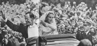 BİR MİLYARDER İLE BİR HİZMETÇİNİN DÜĞÜNÜ New York valisi ve Amerikanın petrol kralı Nelson Rockefeller'in oğlu Steve ile Norveçli bir bakkalın kızı olan Anne Marie'nin hiçbir yerde çıkmamış düğün fotoğraflarını size sunuyoruz. Üstte; Sözde bu küçük kasabada sessiz sedasız evleneceklerdi. Ama kilise kapısında gazetecilerin hücumundan kurtulamayan yeni evliler gelin evine dönerken de halkın coşkun alkışlarıyla karşılandılar. Bu tezahürata otomobilde ayağa kalkarak elleriyle mukabele ettiler. |