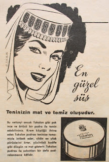 En güzel süs, Teninizin mat ve temiz oluşudur. Bu neticeyi ancak Tokalon gibi pek ince ve örtücü bir pudra ile temin edebilirsiniz. Krem köpüğü ihtiva eden Tokalon pudrası teninize tamamıyla intibak eder, cildin en ufak pürüzlerini örter, yüzünüzü kadife gibi düzgün ve mat gösterir. Tokalon pudrası ile sabahları bir defa pudralanmanız kafidir... Poudre Tokalon Fascination 1959 |