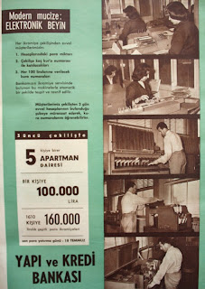 Modern mucize : ELEKTRONİK BEYİN Her ikramiye çekilişinden evvel müşterilerimizin : 1- Hesaplarındaki para miktarı 2- Çekilişe kaç kura numarası ile katılacakları 3- Her 100 liralarına verilecek kura numaraları Bankamızın ikramiye servisinde bulunan bu makinelerle otomatik bir şekilde tespit ve tasnif edilir. Müşterilerimiz çekilişten 3 gün evvel hesaplarının bulunduğu şubeye müracaat ederek kura numaralarını öğrenebilirler. 3. Çekilişte 5 Kişiye birer apartman dairesi, bir kişiye 100.000 lira, 1610 kişiye 160.000 liralık çeşitli para ikramiyeleri. Son para yatırma günü 18 Temmuz 1959 YAPI ve KREDİ BANKASI |