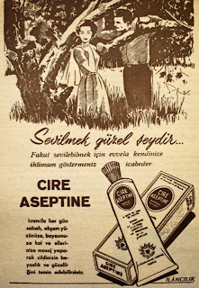 Sevilmek güzel şeydir... Fakat sevilebilmek için evvela kendinize ihtimam göstermeniz icap eder. CIRE ASEPTINE krem ile her gün sabah akşam yüzünüze, boynunuza, kol ve ellerinize masaj yaparak cildinizin beyazlık ve güzelliğini temin edebilirsiniz...1959 |
