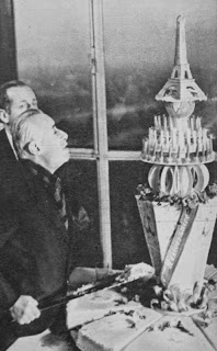 PARİS'İN MEŞHUR EYFEL KULESİ 70. YAŞINI KUTLADI ! Eyfel kulesi ve Paris birbirinin manasını sembolik olarak tamamlayan iki varlıktır. Ucu bulutları delen derin heybetli kule termometreden bileziğe, kol düğmelerinden sigara tabakalarına kadar muhtelif hediyelikleri ile Paris'in bir parçası olarak dünyaya yayılmıştır. Üstte; 1889 yılında açılan kulenin 70. yıl şerefine verilen partide 70 adet mumun süslediği pastayı söndüren bir yetkili görülmekte... |