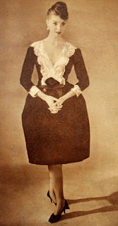 "V" şeklindeki dekolte yaka ile kol kapakları beyaz gipür dantel ile süslenmiştir. Etek belden üç-dört parmak aşağıya kalça üzerine takılmış, içeriden beslenerek kabartılmış...