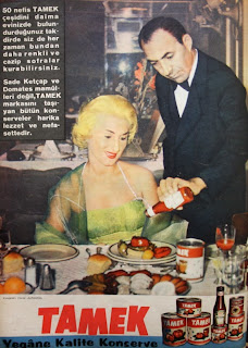 50 nefis TAMEK çeşidini daima evinizde bulundurduğunuz taktirde sizde her zaman bundan daha renkli ve cazip sofralar kurabilirsiniz. Sade ketçap ve domates mamulleri değil, TAMEK markasını taşıyan bütün konserveler harika lezzet ve nefasettedir. TAMEK Yegane Kalite Konserve (Fotoğraf : Fikret Alpkoral 1959) |