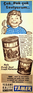 Çok. Pek çok Seviyorum... Annem, dokunur diye her zaman yemiş vermiyor. Halbuki istediğim kadar TAMEK reçel ve marmelatı yememe müsaade ediyor. Bunlar hem yemiş kadar güzel ve lezzetli, hem de bu yüzden kuvvet ilacı içmekten kurtuldum. Nefis 8 çeşit reçel, 7 çeşit marmelat Tamek reçel ve marmelatları hakikaten çok gıdalı, nefis rayiha ve lezzetli aynı zamanda fevkalade ekonomiktir. YEGANA KALİTE KONSERVE TAMEK (1959) |
