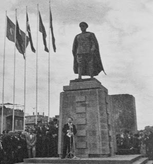DİYARBAKIR'DA ATATÜRK HEYKELİ TÖRENİ Heykeltıraş Hüseyin Anka'nın üç yıl çalışarak meydana getirdiği ve 140.000 liraya mal olan 7 metre yüksekliğindeki Atatürk Heykeli 5 nisan günü yapılan bir törenle açılmıştır. Törende Diyarbakır valisi bir konuşma yapmıştır. Fotoğrafta heykel ve törene iştirak edenler görülmektedir...1964 |