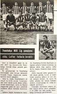FENERBAHÇE MİLLİ LİG ŞAMPİYONU OLDU, LEFTER KÜÇÜKANDOYADİS FUTBOLU BIRAKTI Uzun ve mücadeleli geçen bu seneki Milli lig maratonunda Fenerbahçe, İzmir'de Altay'ı yenerek şampiyon oldu. Bu şampiyonluğu ile Fenerbahçe önümüzdeki sene Avrupa şampiyon kulüpler kupası maçlarında memleketimizi temsil edecektir. Gene bu arada Fenerbahçe'nin en sıkışık ve kritik anında Yunanistan'dan izinli olarak yurda dönen Lefter, evvela İstanbulspor, sonra da Beykoz maçlarında güzel bir oyun çıkararak kulübüne tekrar hizmette bulunmuştur. Lefterin büyük hizmetlerine karşılık Fenerbahçe kulübü Beşiktaş'la anlaşarak Lefter'in futbolu bırakması sebebiyle jübile maçı yapmış. Lefter'de bu maçtan hissesine düşen parayı almıştır. Jübile maçında Lefter gençlere örnek olacak şekilde kıvrak ve istekli futbol oynamış, sahanın en iyisi olarak temayüz etmiştir. Bu oyunu ile Lefter sahadan her haliyle futbol severlerin unutamayacağı bir intiba bırakarak ayrılmıştır. Yukarıdaki resimlerde Lefter'in jübile maçına katılan takım arkadaşları ve Lefter son defa giydiği Fenerbahçe formasıyla görülmektedir...1964 |