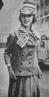 Portakal rengi yumuşak yünlüden önde yakası oval açılmış takma truvakar kollu kruvaze tarzda dikilmiş bir spor tayyör.