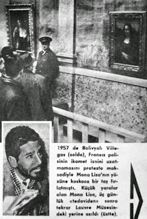 Gizemli tebessümü ile Mona Lisa 457 senelik ömrü müddetince türlü şekillerde kopya edildi, sürrealist ressam Salvador Dali, masum güzele bıyık dahi takıverdi, 21 Ağustos 1911 günü Louvre müzesinden çalındı (daha sonraki sayılarımızda bu bahsi yayınlayacağız) Ve en son olarak 1957'de Bolivyalı Villegas (solda) Fransız polisinin ikamet iznini uzatmamasını protesto maksadıyla Mona Lisa'nın yüzüne koskoca bir taş fırlatmıştı. Küçük yaralar alan Mona Lisa, üç günlük tedaviden sonra tekrar Louvre müzesindeki yerine asıldı (üstte)...1959 |