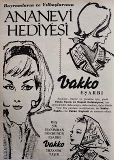 Bayramların ve yılbaşılarının ANANEVİ HEDİYESİ Vakko EŞARBI Bayanlar, baylar ve çocuklar için şimdi Vakko eşarp ve kaşkol koleksiyonu her zamankinden daha zengin, daha modern, daha lükstür. Yeni yıla girerken sevdiklerinizi bir Vakko eşarbı... Bir Vakko kaşkolu ile memnun ediniz. BEŞ ŞIK HANIMDAN DÖRDÜNÜN EŞARBI Vakko İMZASINI TAŞIR...1964 |
