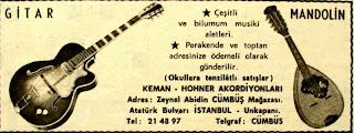 GİTAR - MANDOLİN * Çeşitli ve bilumum musiki aletleri. * Perakende ve toptan adresinize ödemeli olarak gönderilir. (Okullara tenzilatlı satışlar) KEMAN - HOHNER AKORDİYONLARI Adres : Zeynel Abidin CÜMBÜŞ Mağazası Atatürk Bulvarı İSTANBUL - Unkapanı (1964) |