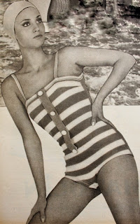1964 mayo modelleri serimizin diğerleri : Üstte görülen model önü pembe-beyaz çizgili ve düz pembe bandı düğmelerle süslü Rilsan'dan bir mayo. |