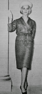 İnce kendinden desenli yünlü kumaştan, omuzları robalı ve truvakar kollu, beli kendi kumaşından yapılmış kemerle bağlanarak vücuda oturtulmuş sade bir takım elbise...