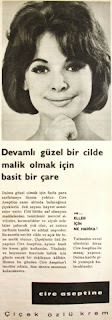 Devamlı güzel bir cilde malik olmak için basit bir çare : Daima güzel için fazla para sarf etmeye lüzum yoktur. Cire Aseptine namı altında bulacağınız çiçeklerin özü şayanı hayret semereler verir. Cilt bütün saf olmayan maddelerden temizlenir; mevcut sivilceler, kırmızılıklar ve siyah noktalar çabucak yok olur. Az zaman zarfında tazelik ve sıhhat neşreder. Bu suretle net bir cilde ve açık bir tene malik olunur. Çiçeklerin özü ile yapılan Cire Aseptine, aynen basit bir krem gibi kullanılır. Yüzünüz ve boynunuz üzerinde tatbik için günde ancak bir dakikanız kafidir. Hemen bu günden Cire Aseptine'i tecrübe ediniz. Son derece memnun kalacaksınız. ve... ELLER İÇİN NE HARİKA ! Yatmadan evvel ellerinize biraz Cire Aseptine ile masaj yapınız. Daima kadife gibi yumuşak kalacaklardır. Cire Aseptine Çiçek Özlü Krem (1964) |