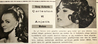 GENÇ KIZLARDA ÇARLESTON VE ANJELİK MODASI Bu yıl Paris'in ünlü güzellik uzmanları genç kızlar için yüze dökülen, kısa, serbest dalgalı çarleston devrinin saç modası ile iri buklelerle arkaya toplanan kurdelelerle süslü anjelik devrinin makyaj ve saç modellerini lanse ediyorlar. Genç kızları tabiilikten uzaklaştırmadan güzelleştirmeyi esas alan bu uzmanların makyaj renklerinde tabiilikten ayrılmayan pembe tonları hakim. Yalnız gözler bariz bir şekilde boyanarak canlandırılmış...1964 |