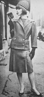 Kalın ve kendinden desenli keten kumaştan, metal düğmeli, hafif takma kollu pratik ve oldukça şık bir tayyör...