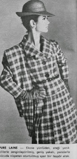 Ekose yünlüden, eteği yatık pli ile zenginleştirilmiş, geniş yakalı, penslerle vücuda nispeten oturtulmuş spor bir tayyör etek...