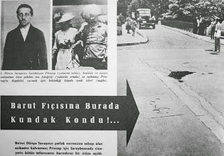 1. Dünya savaşının kundakçısı Gavrilo Princip (yukarıda solda), Arşidük ve eşinin suikastten önce çekilen son fotoğrafı (yukarıda ortada) ve suikastçi Princip'in Arşidük'ü vurmak için beklediği köşede ayak izleri sağda. BARUT FIÇISINA BURADA KUNDAK KONDU !... Birinci Dünya Savaşının patlak vermesine sebep olan suikastin kahramanı Princip için Saraybosna'da cinayetin bütün teferruatını barındıran bir müze açıldı... |